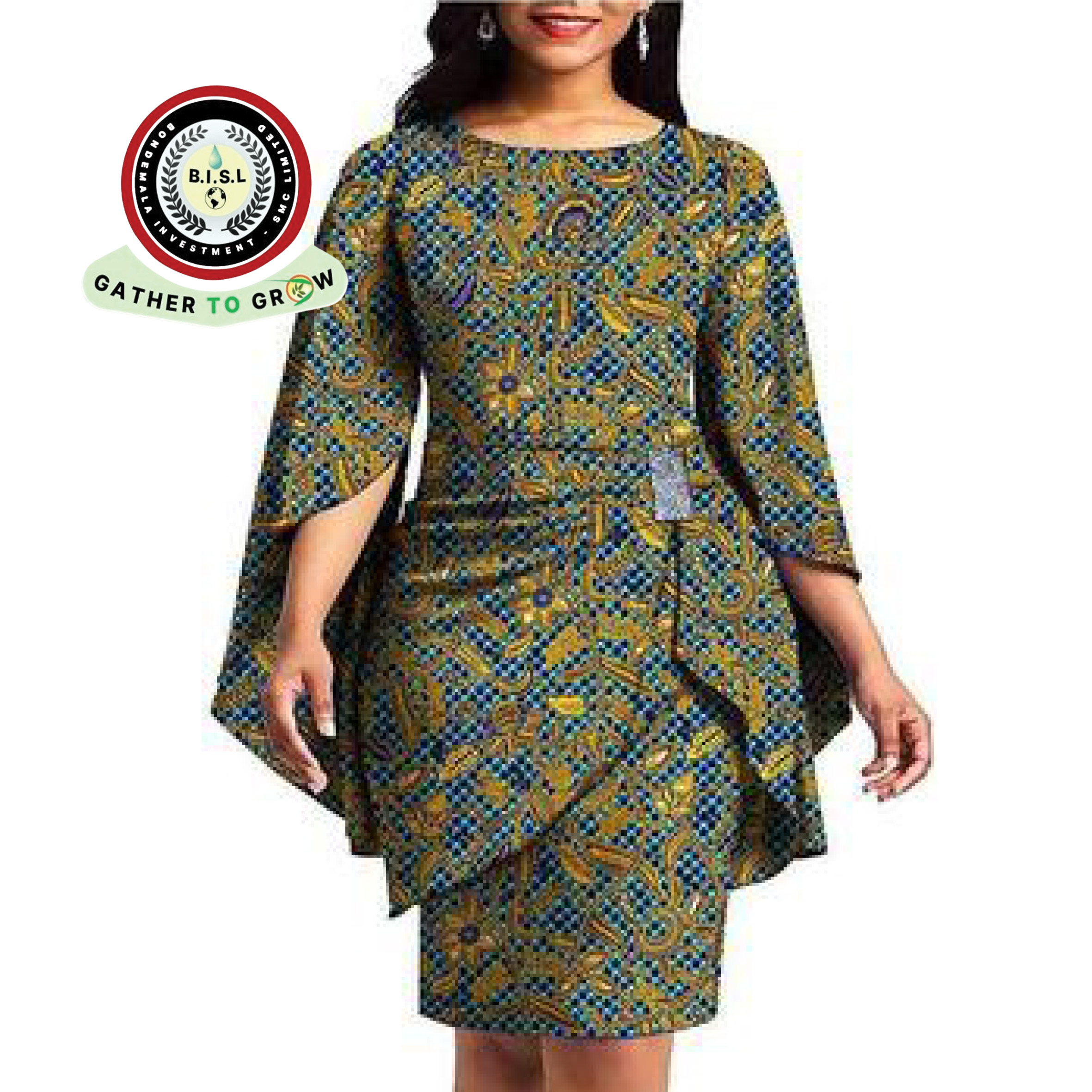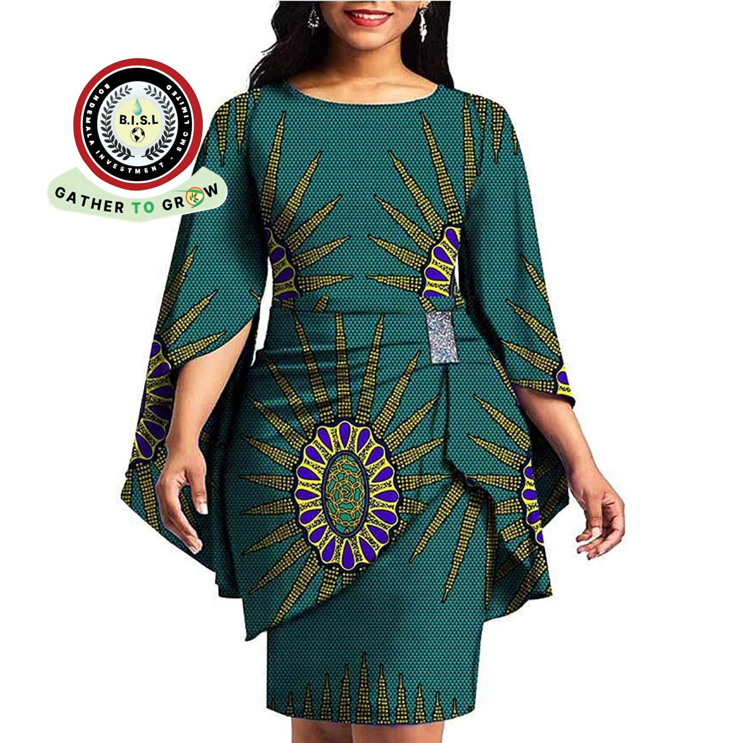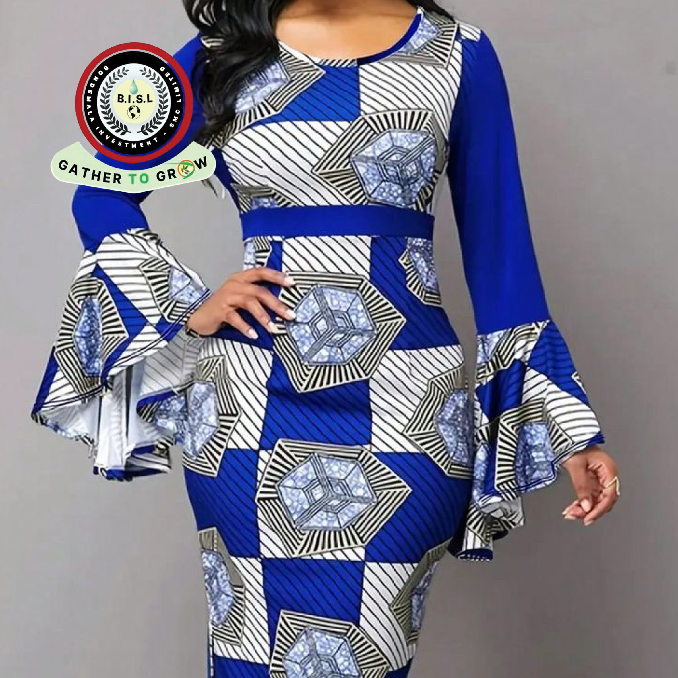 Elegant African kitenge dress available in all sizes, beautifully crafted with vibrant traditional prints.